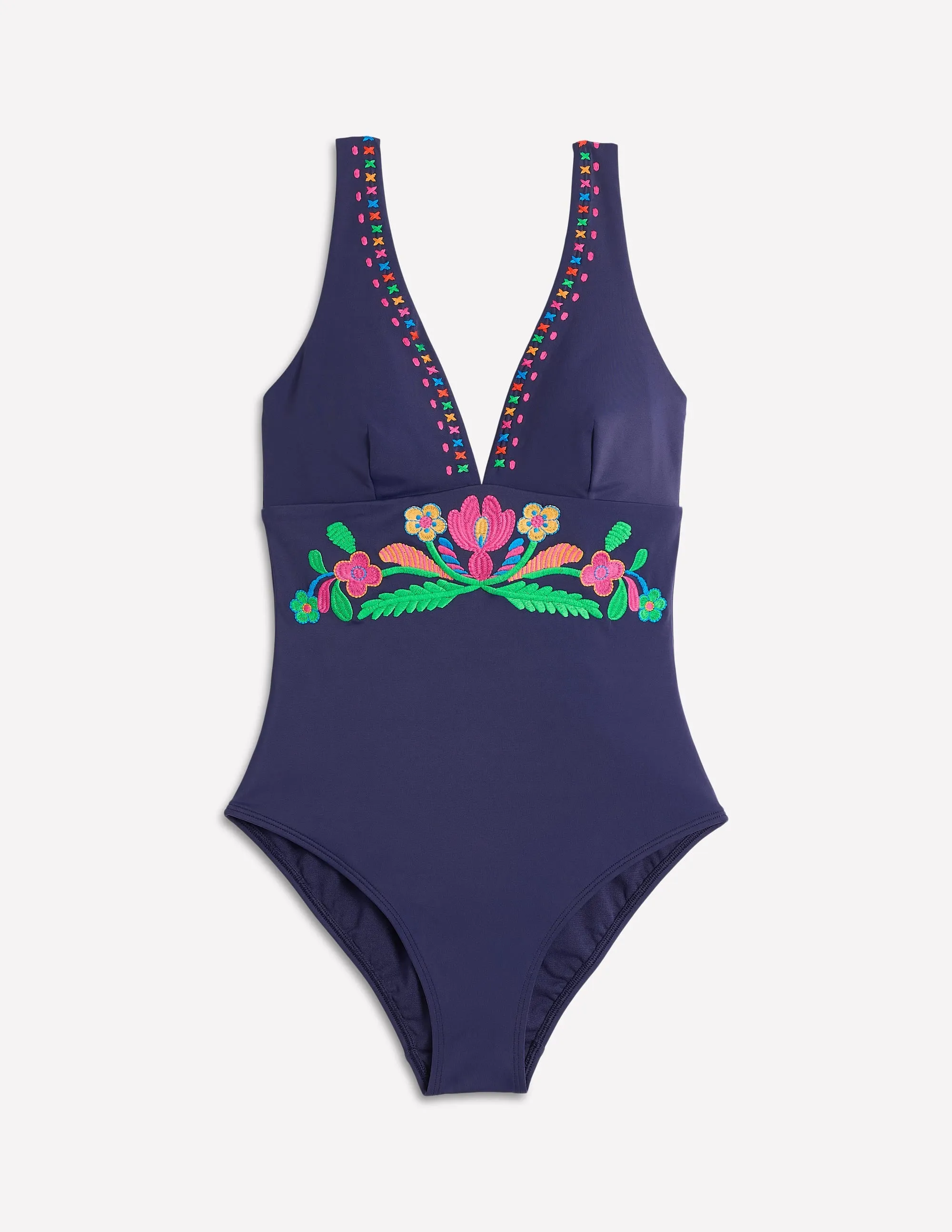 The intricate embroidery on this swimsuit makes it perfect for lounging by the pool, cocktail in hand. The wide supportive straps mean its also ideal for getting stuck into building sandcastles with little ones.with a snug fit